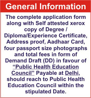 The complete application form along with Self attested xerox copy of Degree / Diploma/Experience Certificate, Address proof, Aadhaar Card, four passport size photographs, and total fees in form of Demand Draft (DD) in favour of “Public Health Education Council” Payable at Delhi, should reach to Public Health Education Council within the stipulated Date or apply online.